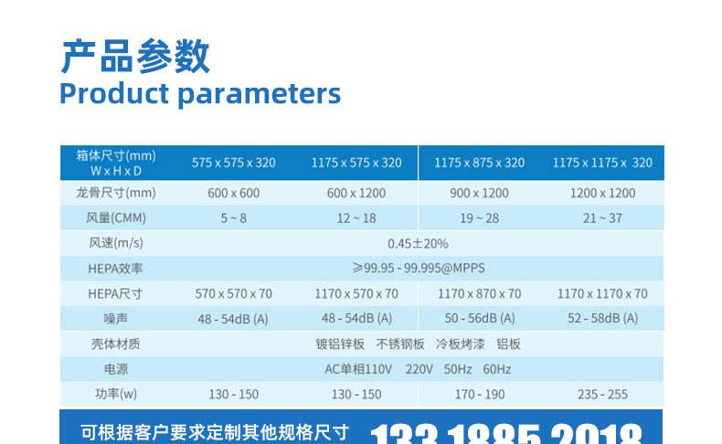 | 尺寸 | 輸出功率(W) | 額定風(fēng)量 | 過(guò)濾效率(0.3μm) |